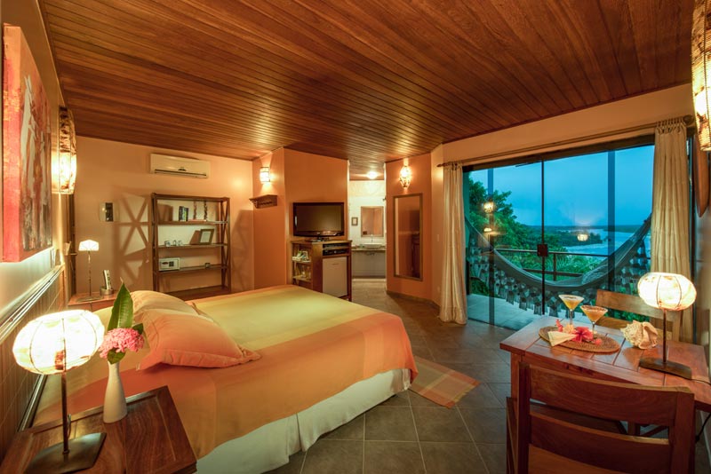 Our spacious acomodations, 30 to 45 square meters in size, offer king size beds, split air conditioning, mini-bars, black-out curtains, telephone, safe, wi-fi internet, TV and DVD, veranda with hammock and large bathrooms. The works of Antônio Remo, the painter from Espirito Santo, decorate the walls, interacting with the landscape views of each apartment.