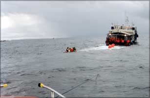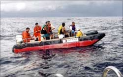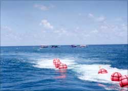 Após das detonações, pessoas do Gia recolheram o plâncton e levaram o para Garapuá para súbita analise. O monitor Jamilton Palma os acompanhou e participou dos testes iniciais. O restante do grupo seguiu com o navio Tropicaliente e os barcos de apoio para o ponto, onde estava instalada a gaiola com as câmaras. |