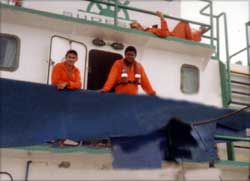Do terceiro grupo, Cristiane C. Loureiro Rocha e Antonio Macedo Filho enviaram um relatório. Registra-se aqui um problema entre a empresa Grant e o monitor comunitário Antonio Macedo. Durante o período de monitoramento, ele dormiu uma noite no navio Fermiza e ficou pescando. No outro dia desembarcou com os peixes em Garapuá para vendê-los. Neste momento, desenvolveu-se uma discussão sobre o fato, que culminou com a determinação de doar os peixes, considerando que os monitores não podem pescar nas embarcações. |