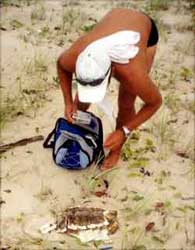Esse monitoramento visa à observação de animais aquáticos vivos ou mortos como peixes, cetáceos e quelônios. Durante o período de embarque foi recolhido um exemplar morto de tartaruga verde (Quelônia mydas), nas proximidades da embarcação Tropicaliente, no dia 12 de março de 2004. A embarcação Seresta foi avisada e fez a captura do animal onde foram observadas marcas de rede de pesca. |