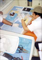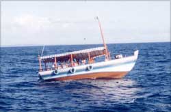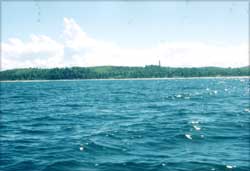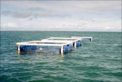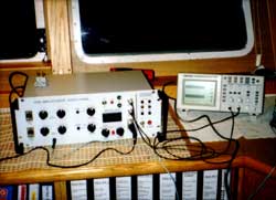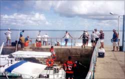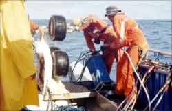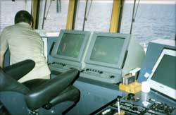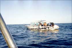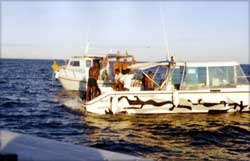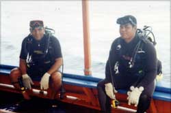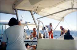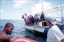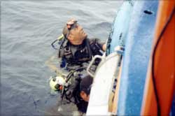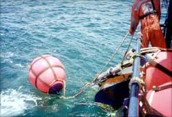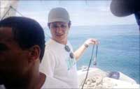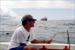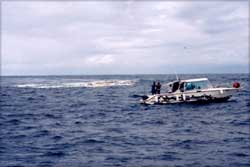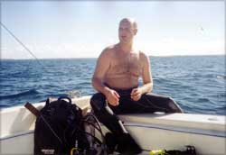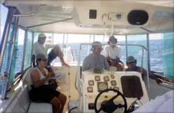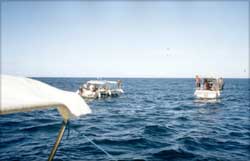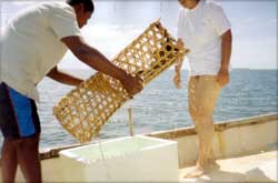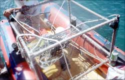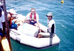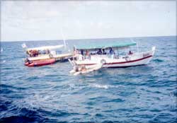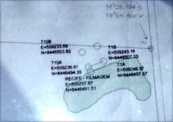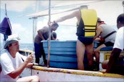 Pela tarde, Antonio Macedo e Achim Ruder acompanharam uma da equipe de mergulhadores, que trabalharam na montagem do experimento com peixes vivos. Após uma passagem em Camamu, onde apanharam 20 cilindros para mergulho, seguiram para a área de estudo, em frente às praias de Barra Grande, numa distância de cerca 8 km e com uma profundidade dágua entre 16 e 20 metros. |