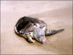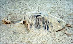No dia 07 de março presenciou-se a coleta de uma tartaruga verde (Quelônia mydas), morta na praia de Bainema e apresentando os mesmos sinais da tartaruga coletada pela embarcação Seresta no mesmo dia. |