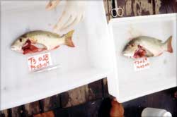 22/02/04 - na realização do monitoramento das praias na Ilha de Boipeba, acompanhando um monitor da empresa, encontramos dois peixes mortos na praia da Ponta dos Castelhanos, Um pirambu de 57 cm, que os urubus já tinham comido parcialmente e um peixe gato de 49,5 cm, que estava inteiro, com a cor normal, os olhos para fora da cabeça e as guerras na parte de cima embranquecidas.